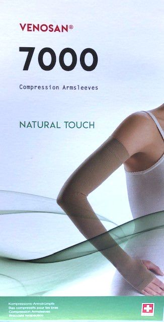 ZG-H ARMSLEEVES- (SILICONE BAND/WITH HAND EXTENSION) VENOSAN 7002 Compression Armsleeves - CLASS 2-23-32 mmHg- NATURAL TOUCH The combination of SeaCellTM and firm knitted fabric not only guarantees excellent therapeutic results, but also cares for the skin. The effective compression stockings are ideal for varicose veins, leg swelling and mild lymphedema. oStrong natural fibres Very resistant seamless knit with two-way stretch in three compression classes. Thanks to their durability they are especially suitable for people who demand a lot from their stockings at work, in sports and in their leisure time. oHigh stiffness Due to the enhanced stiffness - pressure increase related to muscle contraction - the stockings provide a massage effect. VENOSAN 7000 are characterised as shaping, opaque compression stockings with high stiffness. oSkin friendly The material composition combines high stiffness with wearing comfort. COMPOSITION 62 % TACTEL Polyamide 26 % Elastane 8 % Cotton / Baumwolle 4 % Lyocell / SeaCell SeaCellTM is a registered trademark of smartfiber AG, Rudolstadt, Germany